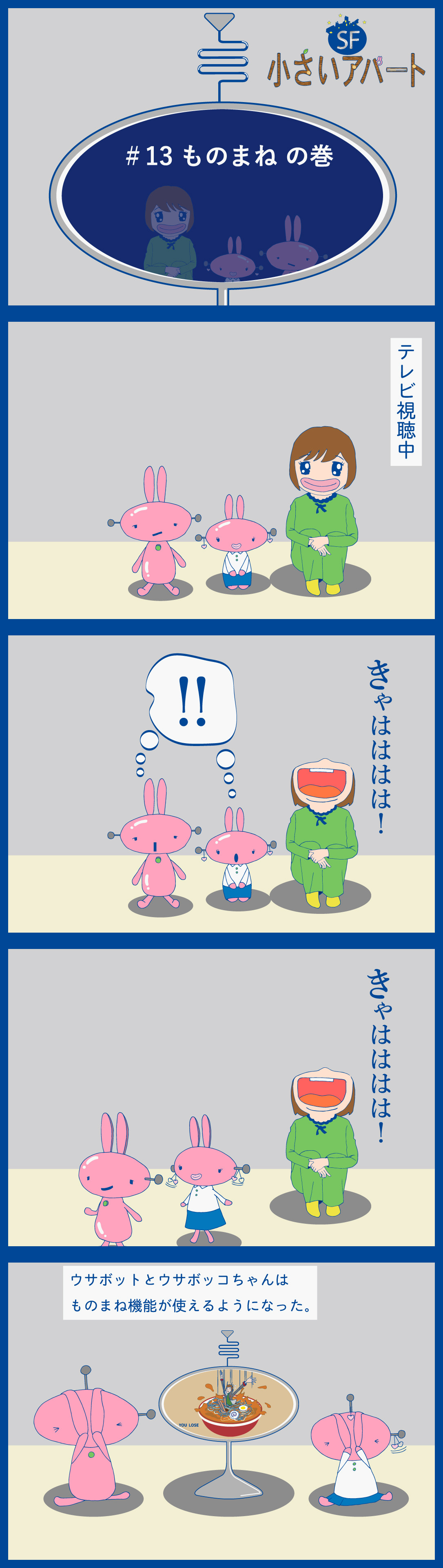 2018年04月13日 ものまね の巻 (4コマ漫画 SF小さいアパート #13) ものまね の巻 (4コマ漫画 SF小さいアパート #13)※画像はクリックで拡大します。一話から見る場合はこの文字をクリックしてください。#13 ものまね の巻 完 タグ :#4コマ漫画