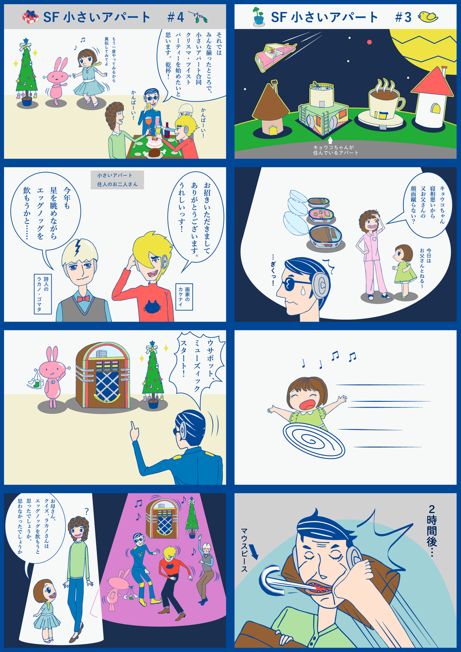 2017年12月28日 お父さん!そのあざどうしたの?の巻 クリスマス・ツイストパーティーの巻(4コマ漫画SF小さいアパート#3#4) 一話から見る場合は、この文字をクリックしてください。【SF小さいアパート】#3 お父さん!そのあざどうしたの?の巻#4 クリスマス・ツイストパーティーの巻 タグ :#ピンクのうさぎ#4コマ漫画#マウスピース