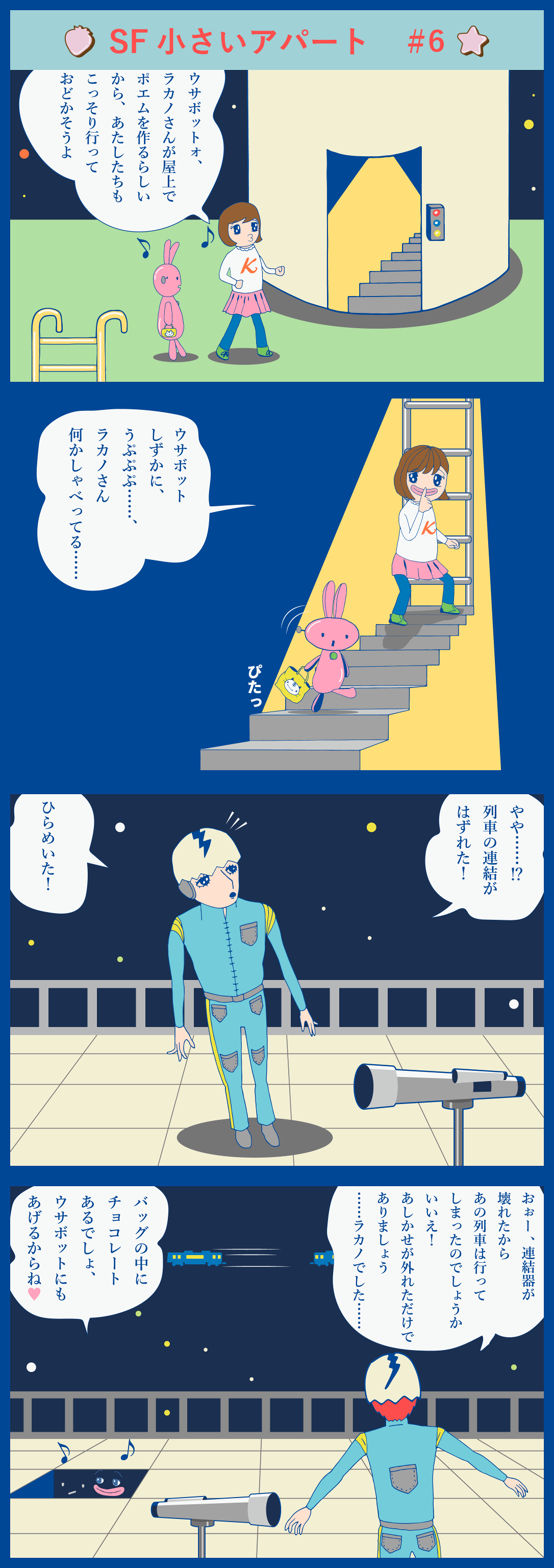2018年02月20日 いちごチョコレートの夜の巻(4コマ漫画 SF小さいアパート#6) いちごチョコレートの夜の巻(4コマ漫画 SF小さいアパート#6)一話から見る場合は、この文字をクリックしてください。☆4コマ漫画 SF小さいアパートいちごチョコレートの夜の巻 #6完 タグ :#いちご#チョコレート#ピンクのうさぎ#4コマ漫画